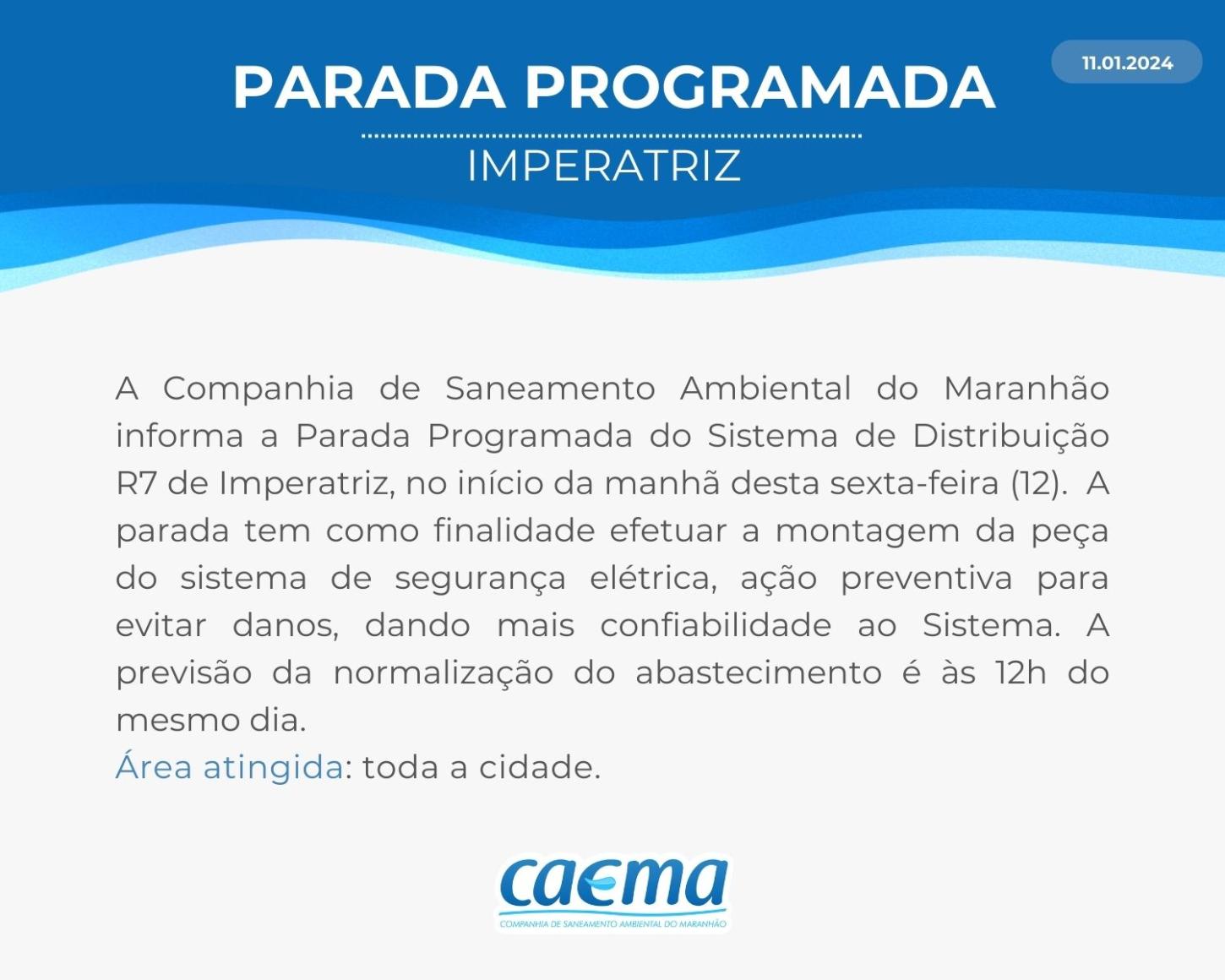 Veja a nota da Caema sobre interrupção de amanha 12:
