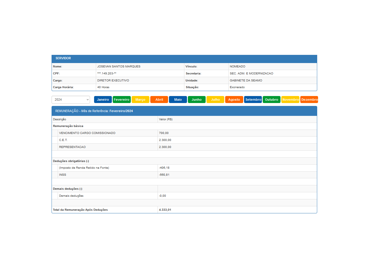 O Jornal Imperatriz entrou em contato com o Josevan questionando sobre o caso, mas segundo ele, todos os dias comparecia para trabalhar, porém ele disse que estava nomeado e trabalhava na extinta Secretaria Municipal de Articulação Política, ou seja, nem ele sabia que estava nomeado na Secretaria Municipal de Administração e Modernização. Questionamos ele mais uma vez sobre o local que ele trabalhava, porém ele disse que só foi trabalhar na Secretaria Municipal de Administração e Modernização em novembro, o que não é verdade, já que no portal de transparência Josevan nunca foi nomeado na Secretaria Municipal de Articulação Política.